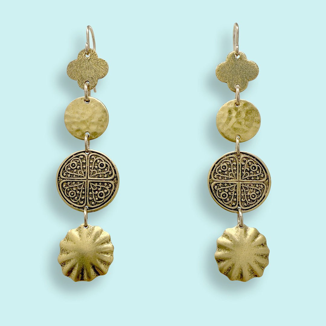 Antique-gold dangle earrings crafted from four stacked, coin-like charms, each with its own unique design. Their cascading silhouette creates movement and shimmer, making them a bold yet timeless statement piece. These earrings are finished with 14k gold-filled French hooks for lasting comfort. Perfect for adding vintage-inspired elegance to both everyday outfits and special occasions.