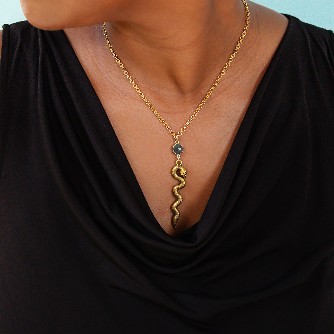 Golden snake and labradorite stone on a gold rolo chain.